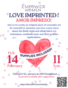 Join us virtually or in person on Tuesday, Feb. 14, at 11 a.m. for our Empower Women Event, Love Imprinted! Create an original piece of wearable art for yourself or someone you love. Supplies included!🖌️🎨