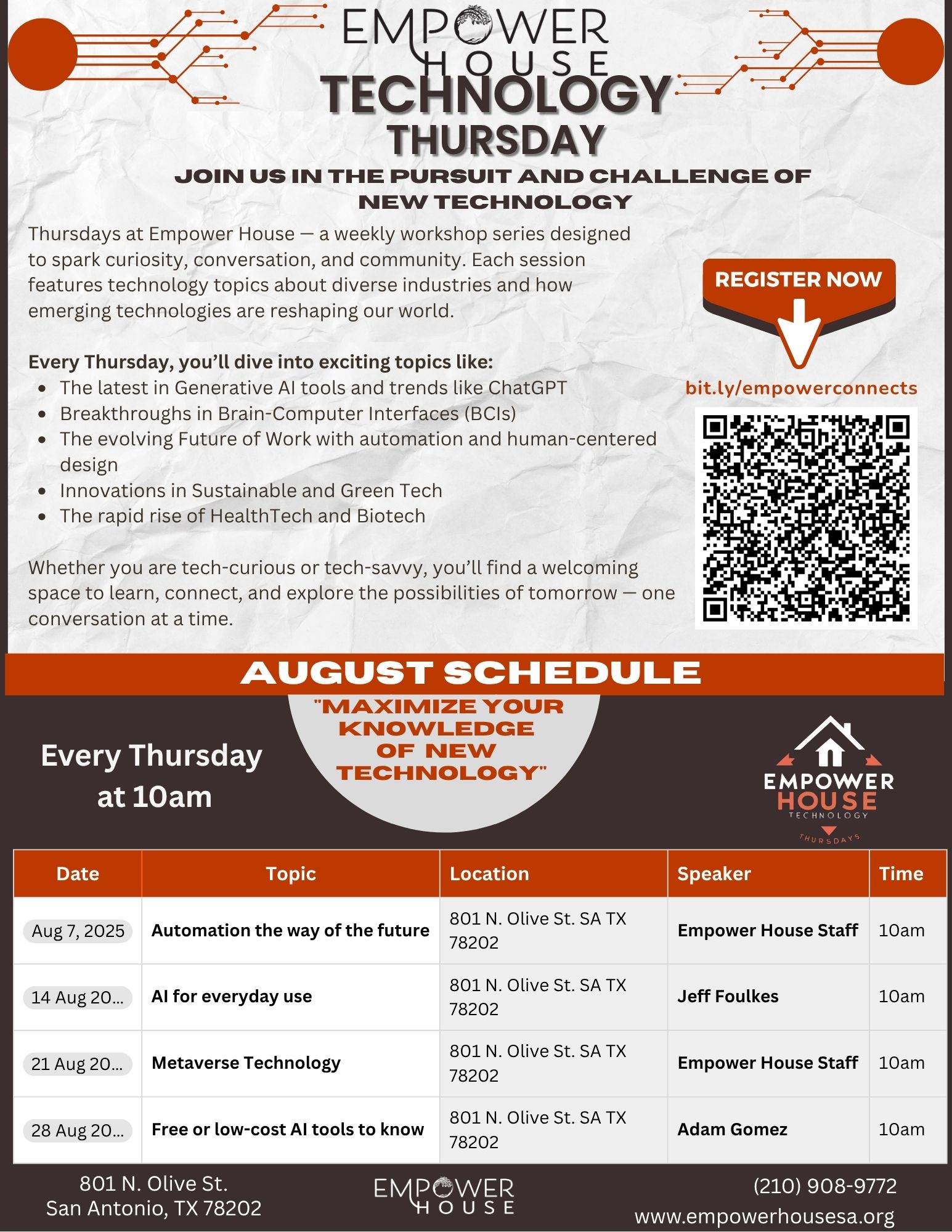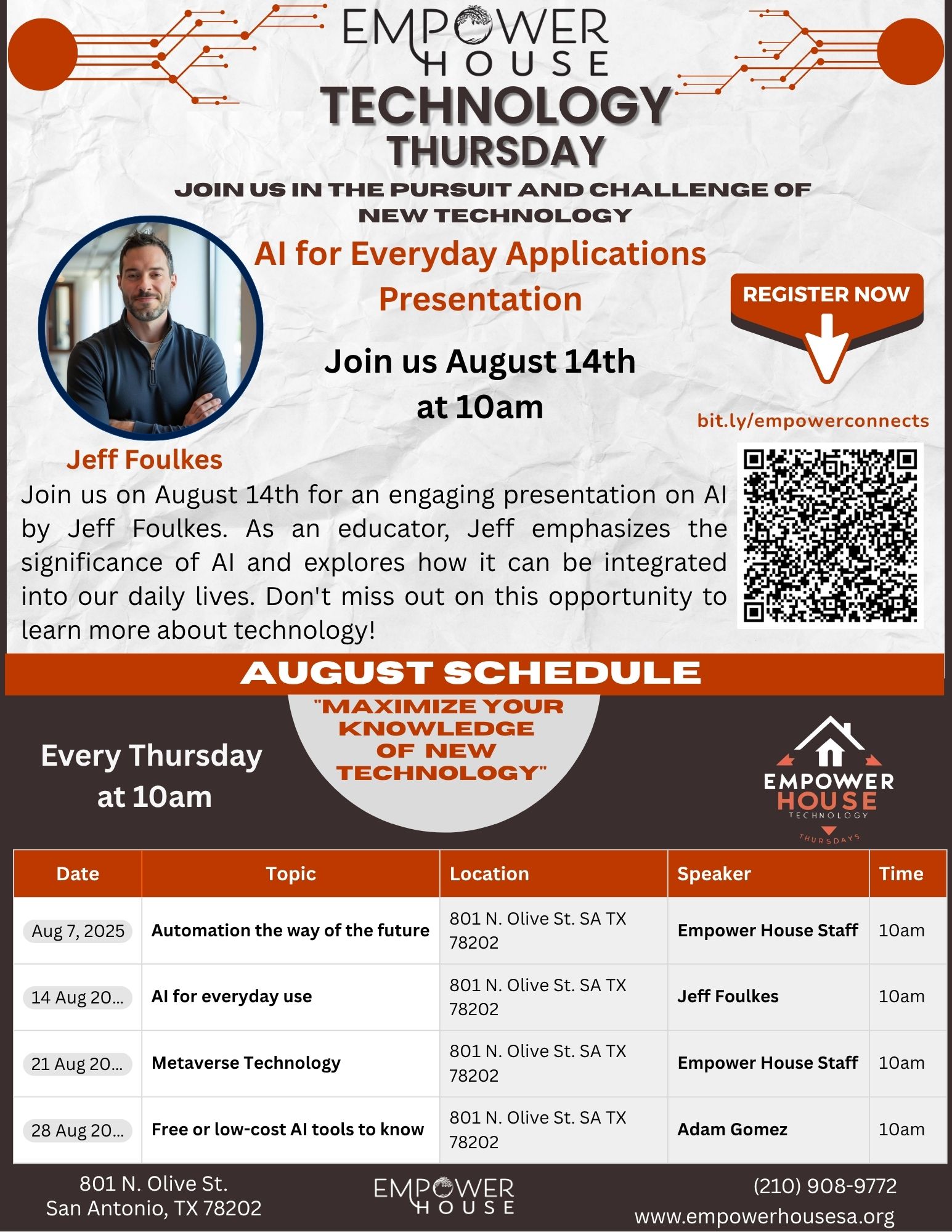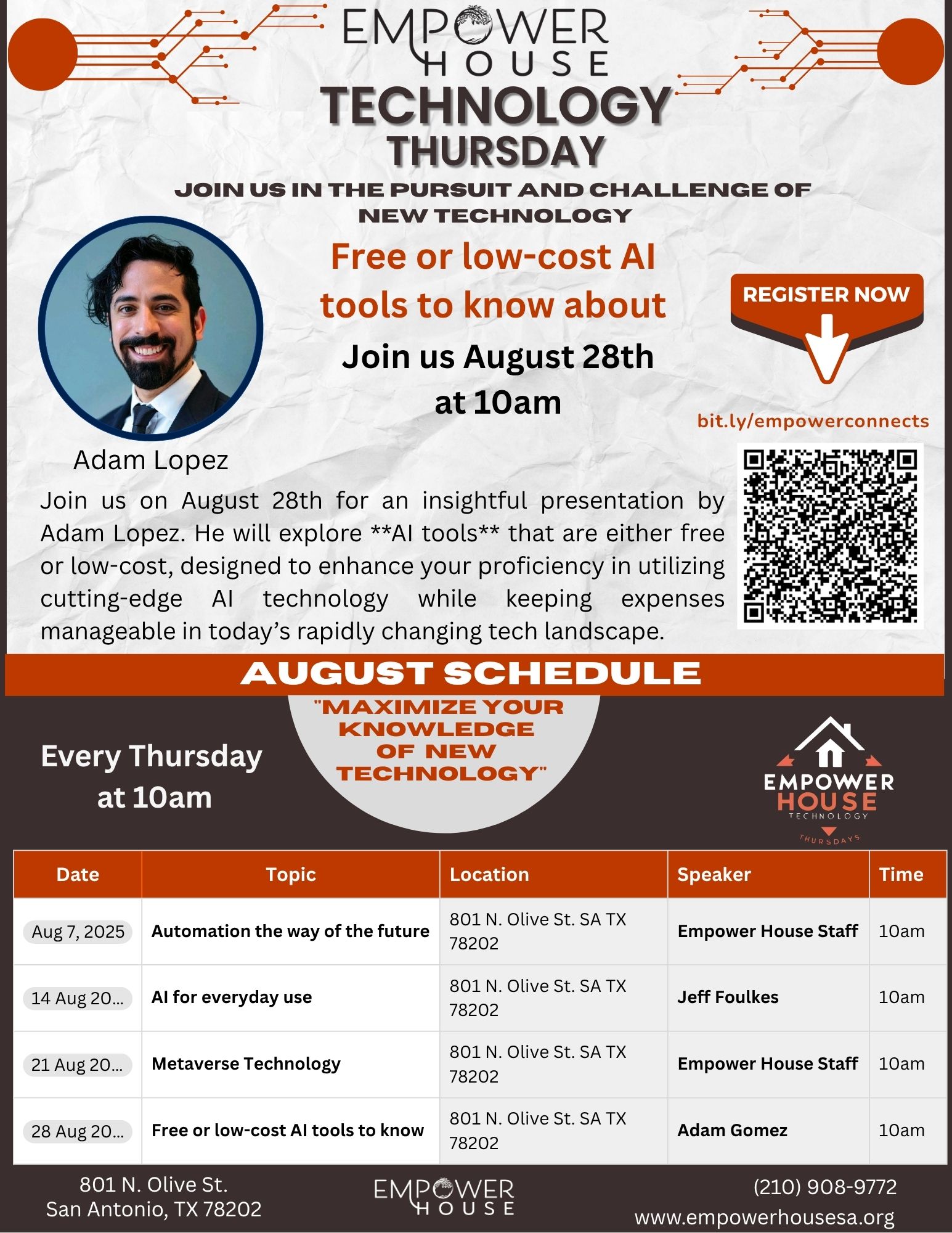 801 N. Olive St. San Antonio, TexasJoin us on August 28th for an insightful presentation by Adam Lopez. He will explore **AI tools** that are either free or low-cost, designed to enhance your proficiency in utilizing cutting-edge AI technology while keeping expenses manageable in today’s rapidly changing tech landscape. Technology Thursday Date: Aug. 28, 2025 Time: 10am-11:30am Location: 801 N. Olive […]